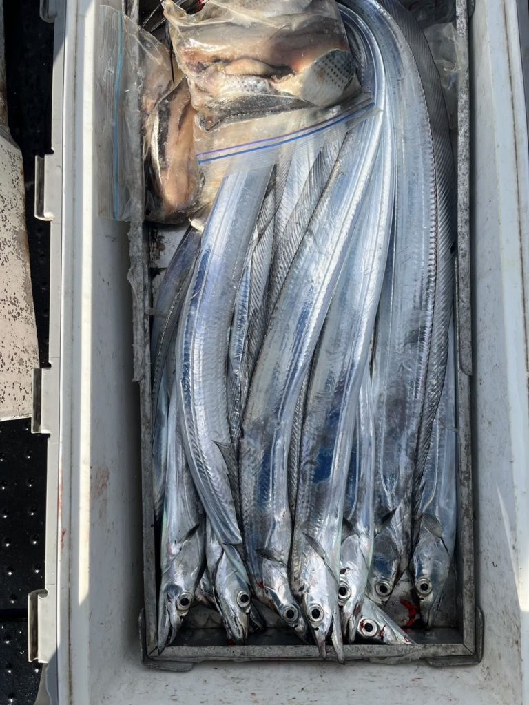 本日はタチウオ甘鯛リレー便にて出船致しました。タチウオはポツポツと上がってはいたものの食い気が立ってきた頃にリレーの甘鯛となってしまい、食い渋り時のタチウオに手の合わなかった方とトップの方で差がついてしまい、20〜5本でした。甘鯛の方は広く探しましたが中々本命に出会えず1〜0でした。外道でキジハタ、カサゴでした。本日はご乗船いただきありがとうございました。