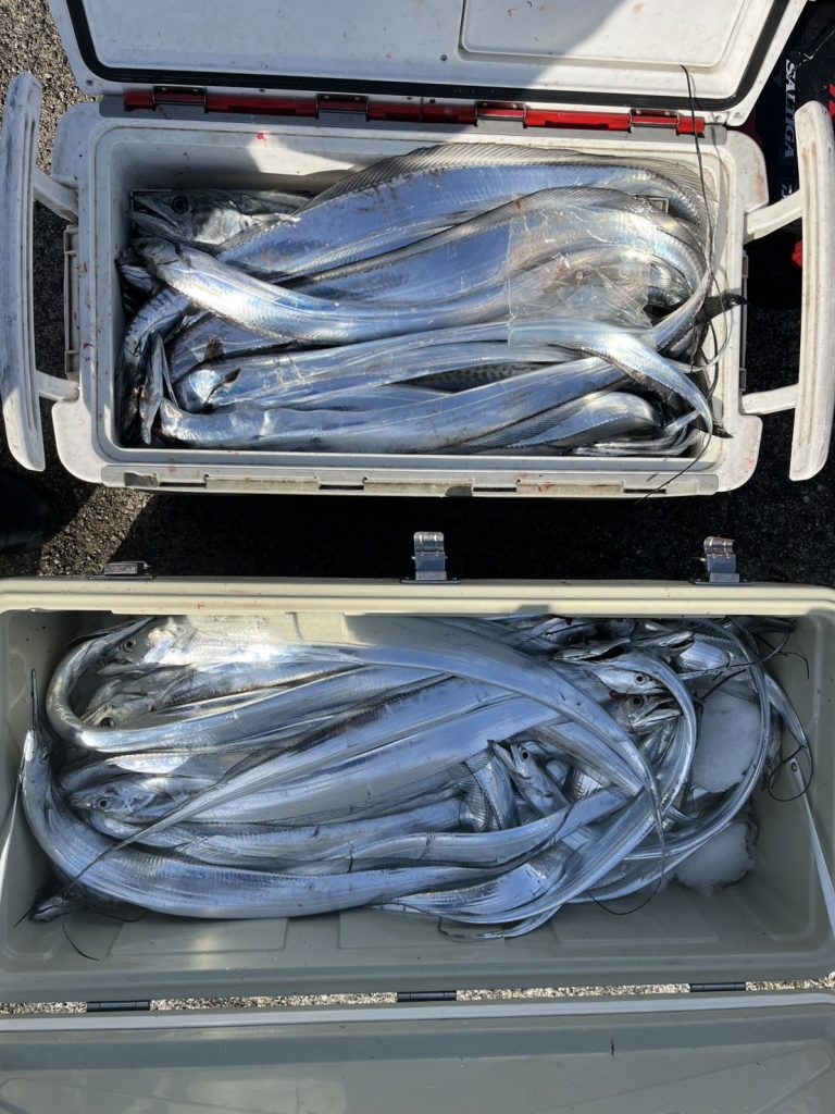 本日はタチウオ便にて出船致しました。タチウオは朝から最後まで釣れ続け、皆さん50本程度釣れました。本日はご乗船いただきありがとうございました。
